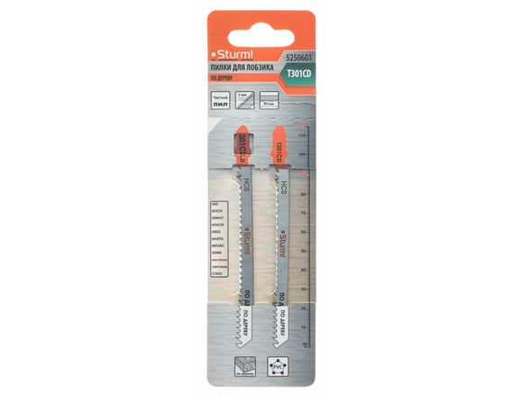 Пилки для лобзика STURM T301CD 2шт, прям.чист.рез,10-68мм,мяг.древ.,ДСП,ДВП,стол.плиты (10/50/600)