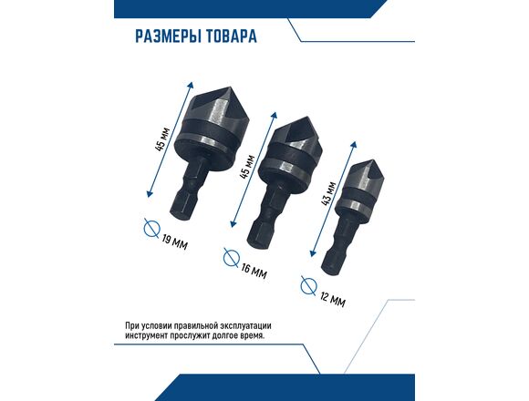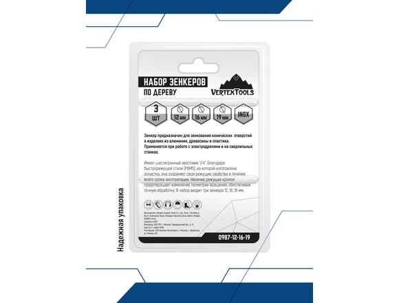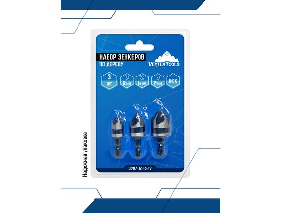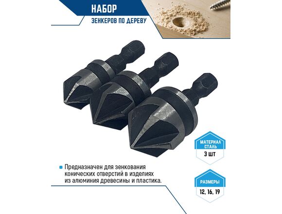 Набор зенкеров по дереву 3 шт, 12 мм, 16 мм, 19 мм vertextools 0987-12-16-19 предназначен для зенкования конических отверстий в изделиях из алюминия, древесины и пластика. Применяется при работе с электродрелями и на сверлильных станках.