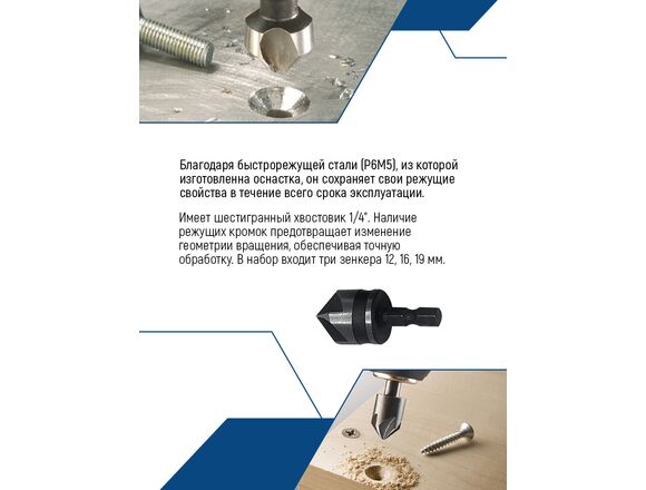 Имеет шестигранный хвостовик 1/4". Благодаря быстрорежущей стали (P6M5), из которой изготовлена оснастка, она сохраняет свои режущие свойства в течение всего срока эксплуатации. Наличие режущих кромок предотвращает изменение геометрии вращения, обеспечивая точную обработку.