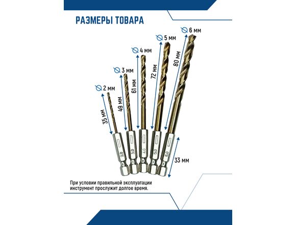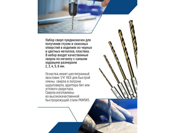Набор сверл предназначен для получения глухих и сквозных отверстий в изделиях из черных и цветных металлов, пластика. В набор входят качественные сверла по металлу с самыми ходовыми размерами 2, 3, 4, 5, 6мм.