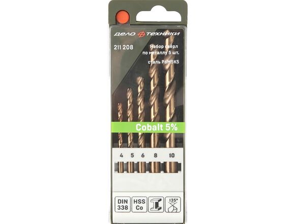 Набор свёрл по металлу Cobalt 5% 5 шт Дело Техники 211208 рассчитан на работу с материалами высокой твёрдости. Легирование кобальтом обеспечивает более высокую термостойкость, что значительно продлевает срок службы сверла.