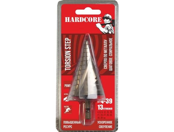 Сверло по металлу СТУПЕНЧАТОЕ HARDCORE 4-39мм TORSION STEP 13 ступеней(титановое напыление)(1/10/50)