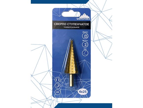 Сверло ступенчатое 4-25 мм, 11 ступеней vertextools 4-25 предназначено для получения отверстий различного диаметра без перестановки режущего инструмента в изделиях из цветных металлов, пластика и стальных листах.