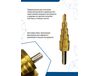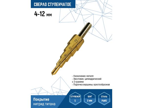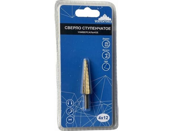 Сверло по металлу ступенчатое 4-12 мм vertextools 4-12 изготовлено из высококачественной быстрорежущей стали и предназначено для получения отверстий в листовых металлических и пластиковых материалах. Покрытие нитридом титана значительно увеличивает сопротивление перегреву во время сверления исрок службы сверла. Рекомендуется работать с использованием смазочно-охлаждающих жидкостей. Диаметр сверления 4-12 мм, шаг 1мм.Предназначено для получения отверстий различного диаметра без перестановки режущего инструмента в изделиях из цветных металлов, пластика и стальных листахХвостовик имеет трехгранную фрезеровку для надежного крепления в патроне инструментаШаг - 2ммСтупеней - 5Сталь P6M5