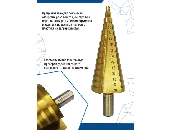 Сверло по металлу ступенчатое 4-32 мм vertextools 4-32 изготовлено из высококачественной быстрорежущей стали и предназначено для получения отверстий в листовых металлических и пластиковых материалах. Покрытие нитридом титана значительно увеличивает сопротивление перегреву во время сверления и срок службы сверла. Рекомендуется работать с использованием смазочно-охлаждающих жидкостей. Диаметр сверления 4-32 мм, шаг 2 мм. Размер хвостовика 10 мм.