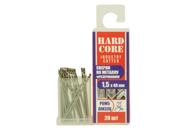 Сверло фрезерованное по металлу Industry cutter Р6М5, 1.5x40 мм, 20 шт Hardcore 146015 предназначено для дрелей. Используется для сверления отверстий в металле.