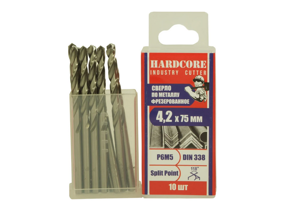 Сверло фрезерованное по металлу Industry cutter Р6М5, 4.2x75 мм, 10 шт Hardcore 146042 предназначено для дрелей. Используется для сверления отверстий в металле.
