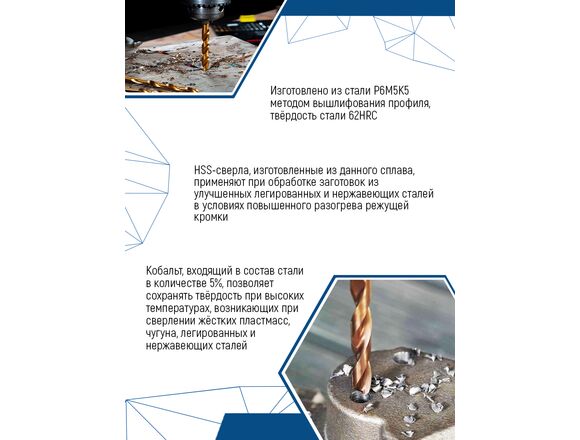 Оснастка изготовлена из высококачественной быстрорежущей стали легированной кобальтом Р6М5К5/М35 (6% вольфрама, 5% молибдена, 5% кобальта), что обеспечивает высокую жаропрочность сверла и позволяет проводить работы повышенной сложности без охлаждения.