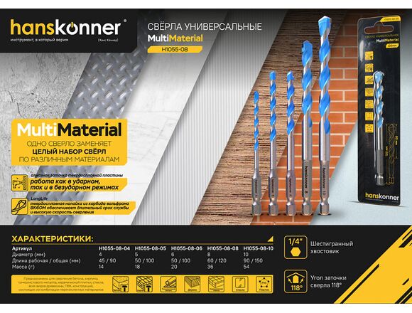 Сверло универсальное HANSKONNER 4мм, твердосплавная напайка, шестигр. хвостовик (10/500)