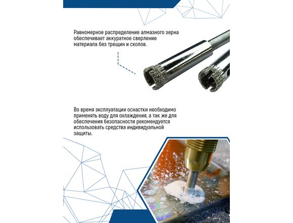 Рабочая кромка коронки имеет алмазное напыление, обеспечивающее высокую точность реза без трещин и сколов. Вертикальные пропилы в корпусе предотвращают деформацию коронки при нагреве во время работы.