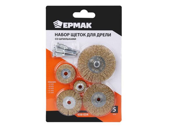 Набор щеток для дрели ЕРМАК 5шт, плоская: 25мм,38мм,50мм,63мм,75мм + 3 шпильки
