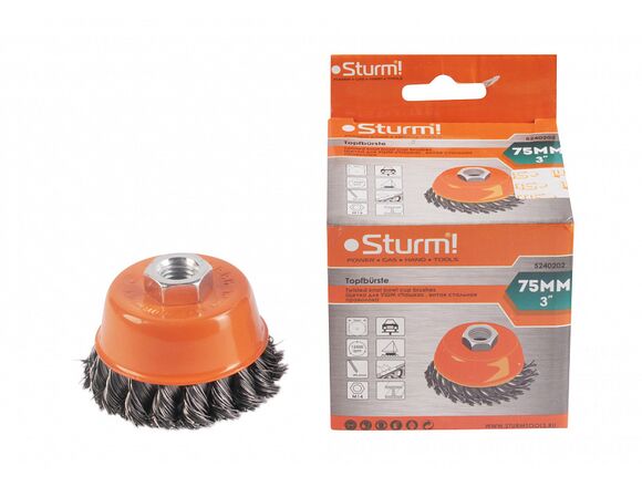 Щетка Sturm 5240202 применяется совместно с угловыми шлифовальными машинами и предназначена для снятия лака, краски, зачистки от ржавчины металлических поверхностей и изделий. Рабочая часть состоит из скрученной в пучки стальной проволоки. Максимальная скорость вращения – 12500 об/мин.