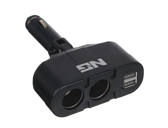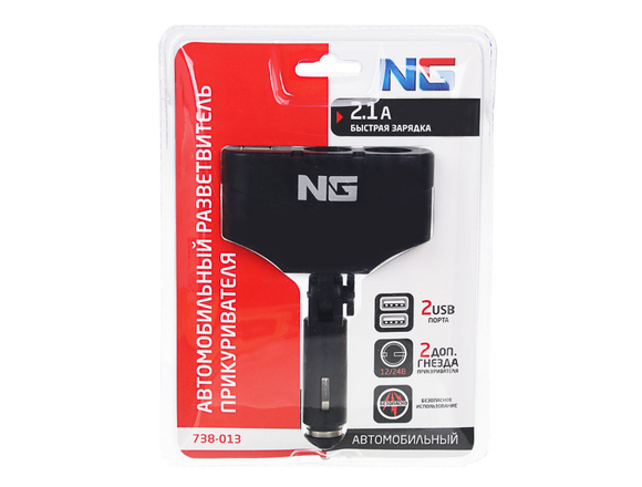 Разветвитель прикуривателя в авто, 2 гнезда, 2хUSB, 60 W, 2.1А, 12/24В,  пластик NG (1/120)