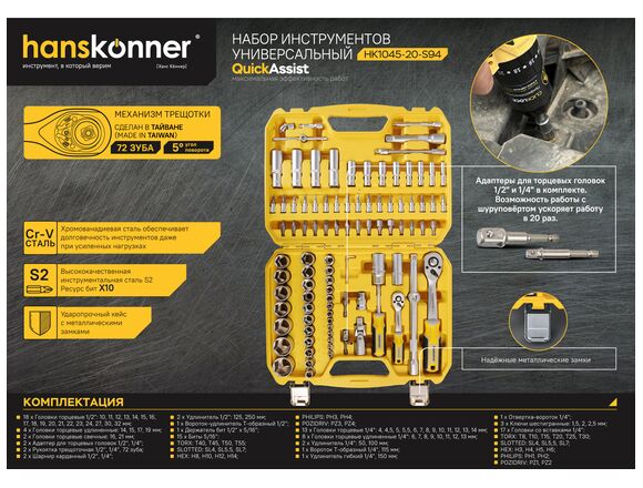 Набор головок HANSKONNER 94 предметов 1/2" и 1/4" (1/4)