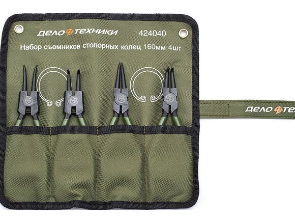 Набор съемников стопорных колец 160 мм х 4 шт тетрон ДТ/16 Дело Техники 424040 пригодится на производстве или в мастерской при снятии или установке стопорных колец - внутренних или внешних.. Рабочая часть изготовлена из хромванадиевой стали, которая обладает прочностью и повышенной стойкостью к изнозу. Удобные рукоятки-чехлы исключают скольжение и обеспечивают лучший контроль над инструментом. Тетроновая сумка предназначена для хранения и компактной переноски инструментов.