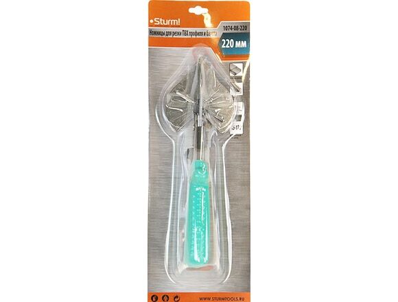 Ножницы Sturm для резки ПВХ профиля и багета 1074-08-220 оснащен пластиковыми накладками на рукоятках. Рифление обеспечивает работу без скольжения.