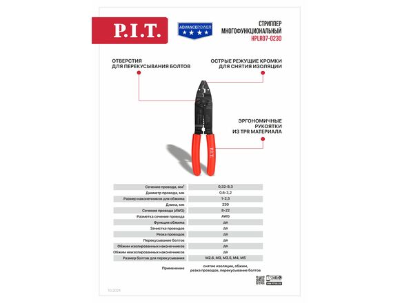 Сьемник изоляции (стриппер) P.I.T. cерия ADVANCE 230мм, зачистка проводов, обжим (6/60)