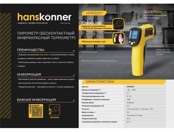 Пирометр HANSKONNER 140*80*38мм, диапазон измерений -32...+350С, точность 2C, (1/10)