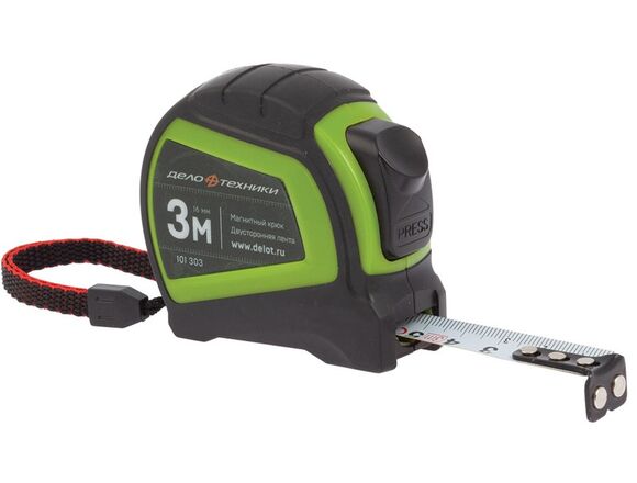 Рулетка Дело Техники 101303 в обрезиненном, эргономичном корпусе с автоматическим фиксатором ленты.