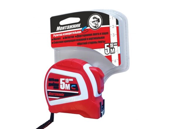 Рулетка с автостопом и магнитом Монтажник двусторонняя 5 м х 19 мм 603519 представляет собой удобный инструмент для работы в любой плоскости. Благодаря использованию двустороннего захвата и наличию разметки с обеих сторон.