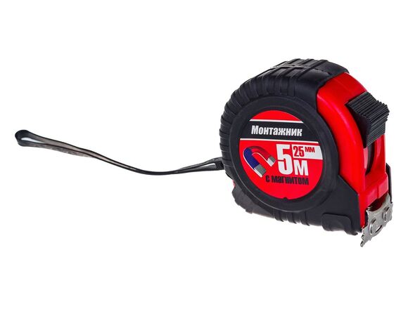 Рулетка с магнитом Монтажник 5 м х 25 мм 601525 поставляется в корпусе с элементами из эко-резины без запаха.