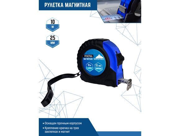 Рулетка vertextools магнитная 10х25 мм 3120-10 применяется для проведения измерений при строительных и монтажных работах. При изготовлении корпуса рулетки применена ударопрочная пластмасса, корпус частично обрезинен. Устройство и обводы корпуса рулетки имеют эргономичную направленность. Механизм фиксации надёжно останавливает мерную ленту. Измерительная лента имеет полимерное покрытие, стойкое к абразивному воздействию. Основание ленты оснащено магнитным зацепом.