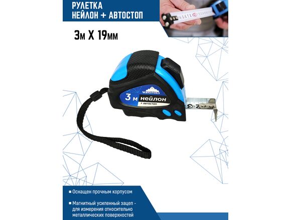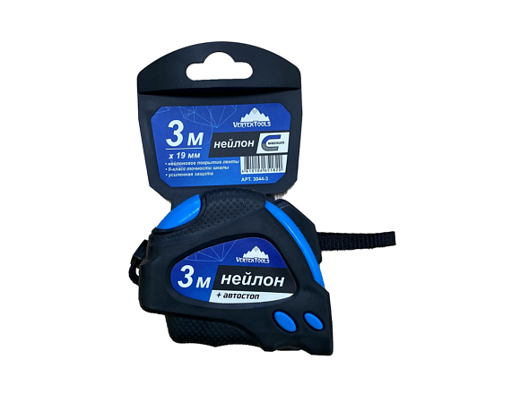 Рулетка vertextools нейлоновая 3х19 мм, автостоп 3044-3 применяется для проведения измерений при строительных и монтажных работах. Подходит для профессионального и бытового использования. Лента выполнена из качественного нейлона, обладающего стойкостью к нагрузкам и долговечностью. Обрезиненный пластиковый корпус обеспечивает комфортную эксплуатацию. Функция автостопа гарантирует быстрое и контролируемое свертывание полотна на нужную длину.