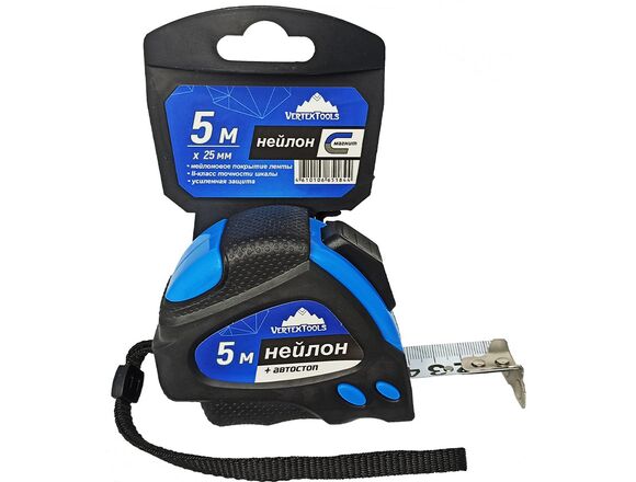 Рулетка vertextools нейлоновая 5х25 мм, автостоп 3044-5 применяется для проведения измерений при строительных и монтажных работах. Подходит для профессионального и бытового использования. Лента выполнена из качественного нейлона, обладающего стойкостью к нагрузкам и долговечностью. Обрезиненный пластиковый корпус обеспечивает комфортную эксплуатацию. Функция автостопа гарантирует быстрое и контролируемое свертывание полотна на нужную длину.