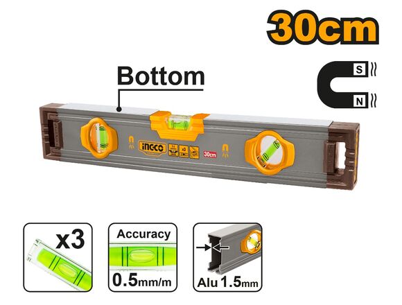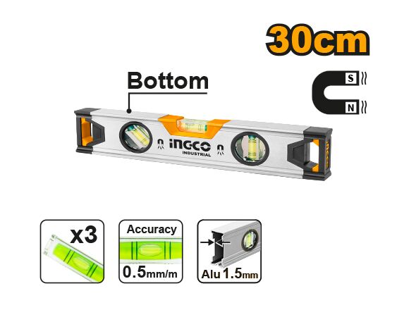 Уровень INGCO INDUSTRIAL МАГНИТНЫЙ (Al 1,5мм) 300мм 3 глазка (5/20)
