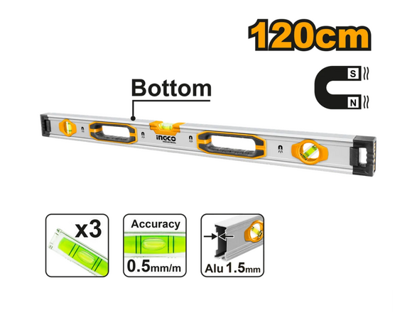Уровень INGCO INDUSTRIAL МАГНИТНЫЙ (Al 1,5мм) 1200мм, 2 РУЧКИ, 3 глазка (5/20)