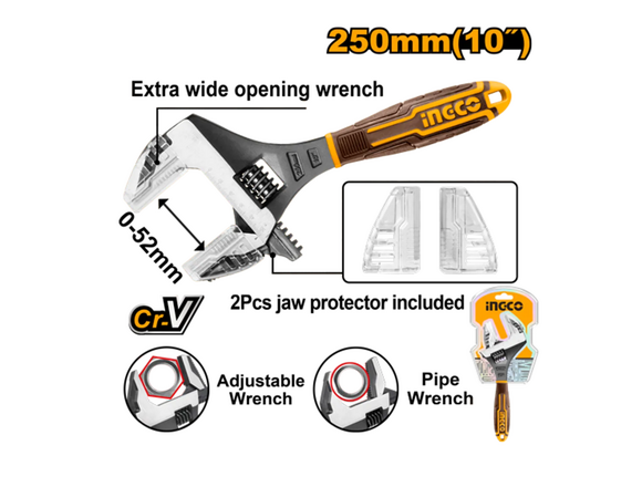 Ключ разводной INGCO INDUSTRIAL короткий 2 в 1 (разводной/трубный), 250мм, 0-52мм (6/24)