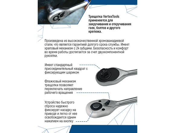 Трещотка для торцевых головок vertextools 3/8" 0029-08-3/8 применяется для закручивания и откручивания гаек, болтов и другого крепежа. Произведена из высококачественной хромованадиевой стали, что является гарантией долгого срока службы. Инструмент имеет храповой механизм с 24 зубцами. Безопасность и комфорт во время работы достигается за счет двухкомпонентной рукоятки. Трещотка имеет стандартный присоединительный квадрат с фиксирующим шариком. Флажковый механизм трещотки позволяет переключать направление рабочего вращения. Устройство быстрого сброса надежно фиксирует насадку на приводе и легко от нее освобождается одним нажатием на кнопку.