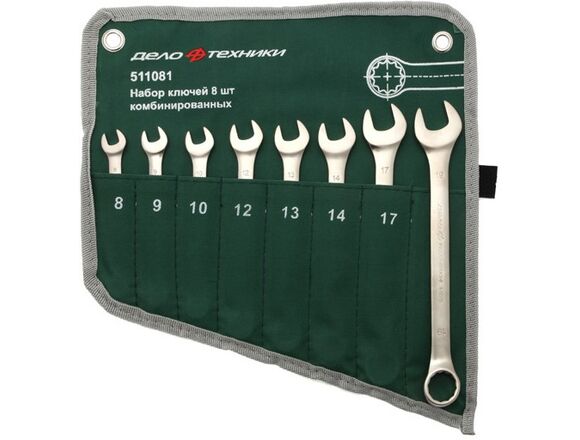 Корпус набора комбинированных ключей 8 шт сумка ДТ/20 Дело Техники 511081 выполнен из хромванадиевой стали, прочной и надежной в применении.