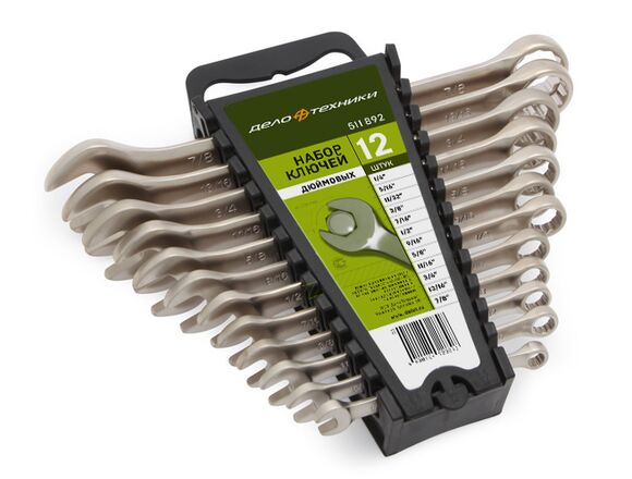 Набор комбинированных дюймовых ключей 12 шт холдер ДТ/10 Дело Техники 511128 предназначен для монтажа и демонтажа крепежных соединений. Применяется на строительно-ремонтной площадке, гараже, автомастерской. Набор включает 12 ключей, каждый из которых имеет рожковую и накидную головки. Инструмент изготовлен из прочной хромванадиевой стали, покрытой защитным лаком - для исключения образования коррозии. Инструменты размещены на холдере.