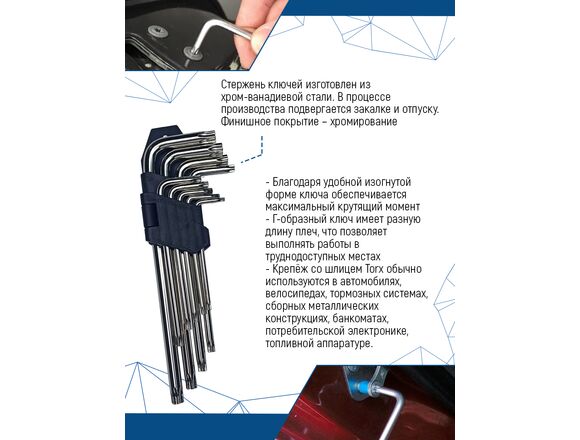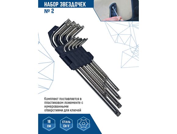 Г-образная форма ключей обеспечивает высокий крутящий момент. Комплект поставляется в пластиковом ложементе с нумерованными отверстиями для ключей, в комплекте 9 штук.