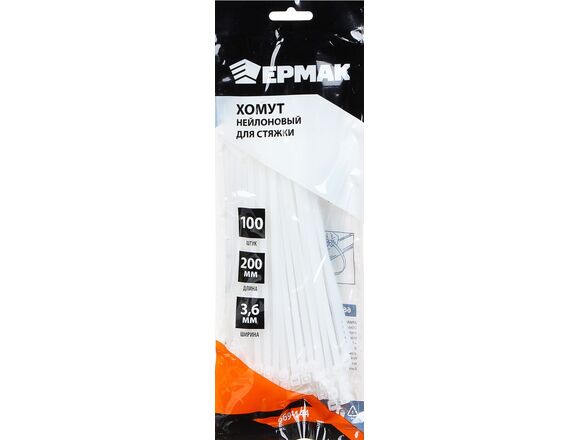 Нейлоновый хомут для стяжки ЕРМАК 3,6х200 мм, белый, 100 шт/уп. 669-144 применяется при связке кабелей или различных проводов для их дальнейшей укладки в короба, на лотки, кабель-каналы, гофрированные или жесткие трубы.
