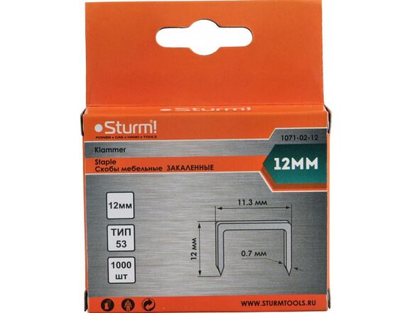 Скоба Sturm 1071-02-12 является сменным элементом для степлеров. Изготовлена из углеродистой стали и закалена. Применяется для скрепления между собой различных материалов. Тип скобы — 53. Количество в упаковке — 1000 шт.