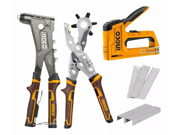 Набор "АКЦИЯ" INGCO INDUSTRIAL 3шт (степлер 2 в 1/заклепочник/дырокол + скобы/гвозди) (1/10)