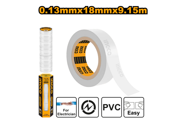 Изолента INGCO 9м*18мм*0,13мм белая ПВХ (10/300)