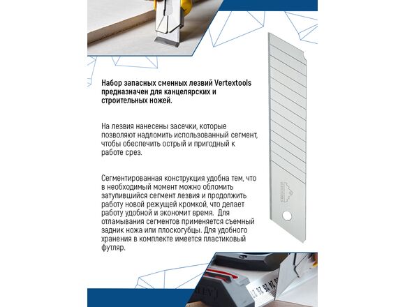 Лезвия каленные (5 шт; 25 мм) vertextools 0029-25-01 являются сменным элементом для технических ножей. Применяется для реза тонких неплотных материалов: линолеума, картона, бумаги, пластика, кожи, резины и т.д. Прочное стальное лезвие с двойной заточкой имеет 7 режущих сегментов.