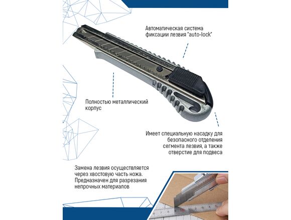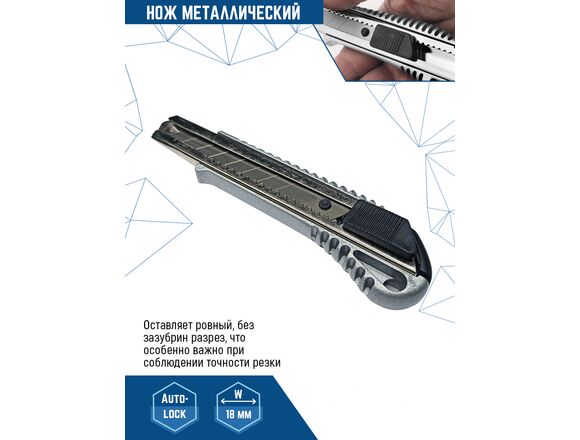 Малярный нож vertextools 18мм, металлический 0044-18-02 имеет усиленную конструкцию, оснащен выдвижным лезвием и системой фиксации. Предназначен для работы с ковровыми покрытиями, гипсовыми плитами, пленкой и т.д.