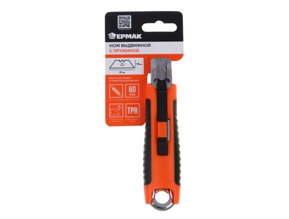 Нож с трацепевидным лезвием ЕРМАК выдвижной с пружиной 19*61мм, КОЛЬЦО МЕТАЛЛ (арт.2)