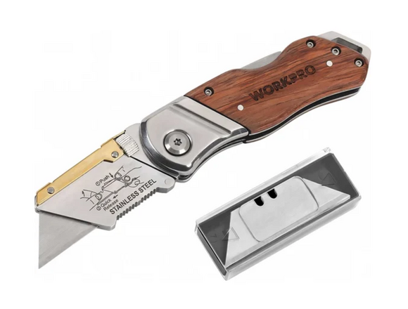 Складной нож WORKPRO ручка из дерева, 10 лезвий, трапециевидные лезвия WP211014 используется для резки ковра, бумаги, пластика, кожи, картона, алюминиевого листа и др. Нож легко складывается до компактного размера, чтобы поместиться в кармане рабочей одежды. Специальный механизм обеспечивает быструю смену лезвий. Острое закаленное лезвие выполнено из стали SK5, обладающей высокой прочностью и долговечностью. Зажим для ремня служит для удобной носки ножа на ремне брюк. Рукоятка из розового дерева премиум-класса с контурной отделкой обладает стойкостью к износу, легким весом и эргономичной формой. Длина ножа 165 мм, длина в сложенном виде 105 мм.