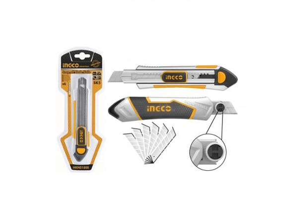 Нож с сегментным лезвием INGCO INDUSTRIAL 18мм 5шт*SK5, автозамок+ 2 ФИКСАТОРА, МЕТАЛЛ (12/48)