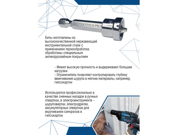 Набор бит с ограничителем Vertextools ОГ-PH2-50 предназначен для монтажа/демонтажа крепежных изделий, имеющих шлиц PH2, с помощью ручного инструмента или шуруповерта.