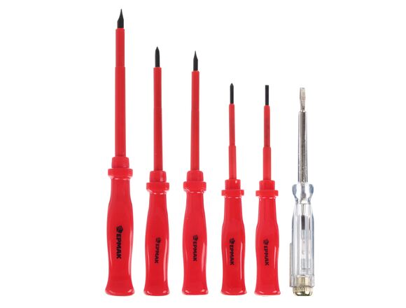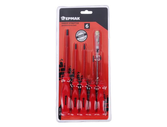 Набор отверток ЕРМАК 6шт диэлектрические (SL5.5*125,SL4*100,PH1*100,SL3*75,PH0*75,тестер 140мм) 651-064 имеет высокую прочность за счет качественного соединения стержня и рукоятки. Легко держать в руках.