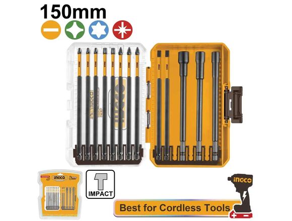 Набор бит ударных INGCO PH1/PH2/PH3PZ1/PZ2/PZ3SL4/SL5T25/T30*150мм 6/8/10*150мм УДЛЕНЕННЫХ (12/60)