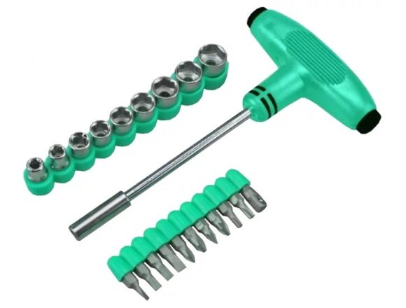 Набор отверток Sturm 1040-09-S21 включает в себя Т-образную рукоятку, комплект бит и шестигранных торцевых головок.