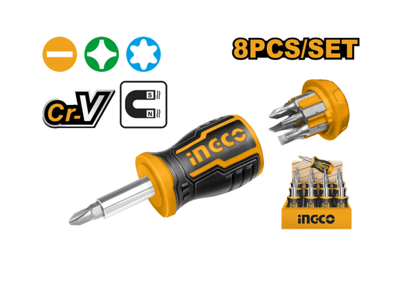 Отверткa короткая с битами INGCO 8 в 1 МИНИ (ПРОМОупаковка 12шт) (6/48)