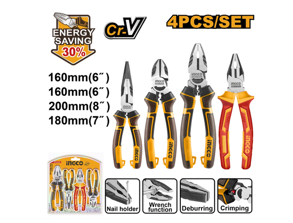 Набор шарнирно-губцевого инструмента состоит из четырех предметов. Такой набор очень удобен для выполнения различных операций в области слесарно-монтажных и диэлектрических работ.